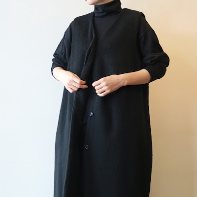 ゆったりとしたシルエットでシャツやカットソーの上はもちろん、ニットの上にも無理なく羽織っていただけます。袖がないのでコーディネートの幅が狭いのでは?と思ってしまうかもしれませんが、ロング丈でも袖がない分軽快さがあり、この上にジャケットやパーカーなど他のアウターを着用することで調節ができレイヤードも楽しめます。